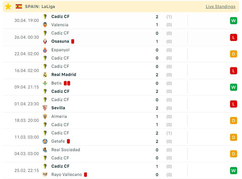 Thống kê 10 lần chạm trán trong quá khứ thì Atletico Madrid cũng chiếm ưu thế với 6 chiến thắng, 3 trận hoà và chỉ để thua Cadiz duy nhất 1 trận.