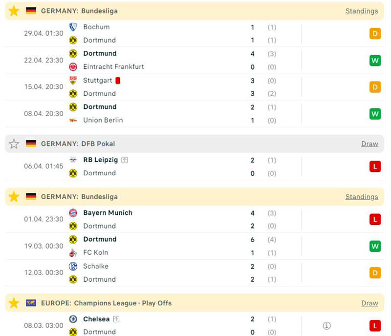 Phong độ thi đấu giữa Dortmund vs Wolfsburg