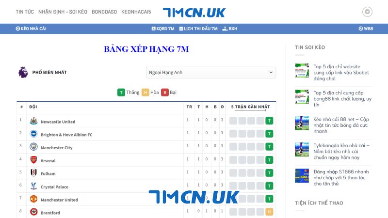 Bảng xếp hạng bóng đá tại 7mcn sẽ được cập nhật liên tục. Bạn có thể xem theo chế độ tổng thể, sân nhà/sân khách, 5 trận đấu gần nhất, thống kê thành tích đối đầu, phân tích tỷ lệ cược,… Tất cả đều được cập nhật liên tục sau khi trận đấu chính thức kết thúc.